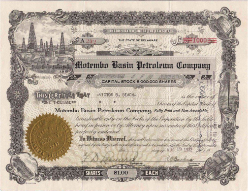 Acción de Montembo Basin Petroleum Company a nombre de Víctor B. Beach (1932). De Cuba, a lo Cubano [de Cuba, a lo Cubano]. (15 de mayo de 2024). Motembo. Facebook. https://www.facebook.com/photo/?fbid=1052389221449907&set=a.1052388954783267