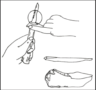 Dibujo realizado por Guillermo Baena González, donde se observa la función y características del artefacto recuperado en el sitio San Antonio I. Baena, G. (1992). Clasificación tecnotipológica de un ejemplar de obsidiana colectado en el sitio arqueológico “San Antonio I” en la península de Guanahacabibes [Inédito]