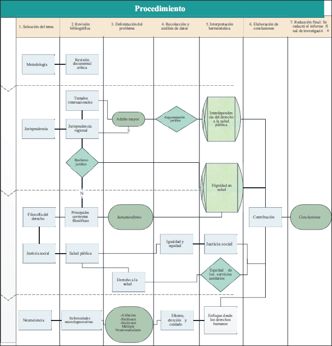 Se llevó a cabo un estudio desde el paradigma cualitativo con el método hermenéutica jurídica, lo que se refiere a una investigación documental crítica (Asmarudin, 2022; Padrón Medina et al., 2022). Complementando con el método fenomenológico hermenéutico de Paul Ricoeur (2001, 2003) Partiendo desde una interpretación del derecho público de la salud con enfoque de los derechos humanos, es decir, la conceptualización de las disposiciones para entender el término de la salud digna como un elemento primordial que emana de la dignidad humana y encamina hacia la justicia social. Finalmente, se hace un análisis concreto del derecho a la salud con adultos mayores en estado de vulnerabilidad debido a padecimientos neurológicos (Norato Vanegas, 2021; Pilarska, 2021).