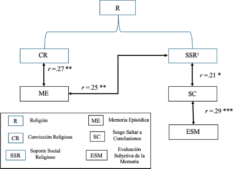 Fuente: Elaboración propiaNota. R: Creencias religiosas, CR: Convicción religiosa, SSR: Soporte social religioso, SC: Sesgo de saltar a conclusiones, ME: Memoria episódica, ESM: Evaluación subjetiva de la memoria *p< .05, **p< .01, ***p< .001 1SSR es la única variable que correlaciona con un tipo de memoria (ME o ESM) pero, no correlaciona a la vez con la variable de memoria (M).