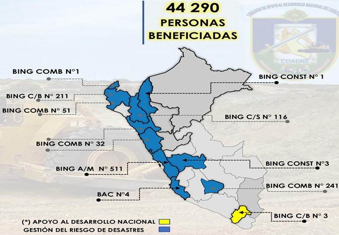 El apoyo al desarrollo nacional se da mediante el Comando de Apoyo al Desarrollo Nacional del Ejército (COADNE) que planifican dicho apoyo según las prioridades establecidas, para ello cuentan con los Batallones de Ingeniería que realizan la construcción y mantenimiento de carreteras, puentes, túneles, vados, etc. que son esenciales para la conexión y desarrollo de las comunidades. Asimismo, el COADNE dispone de los Batallones de Asuntos Civiles en condiciones de realizar actividades de desarrollo e inclusión social, gestión de riesgos de desastres y desarrollo e integración fronteriza (Suárez-Alemán y Domínguez, 2024; Castillo-García, 2021). Estos Batallones de Ingeniería son empleados de manera efectiva y rápida; sin embargo, existe la problemática que dichas unidades no cuentan con los equipos suficientes que optimizan la eficiencia de la unidad frente a la ocurrencia de desastres (Alvarado, 2021).